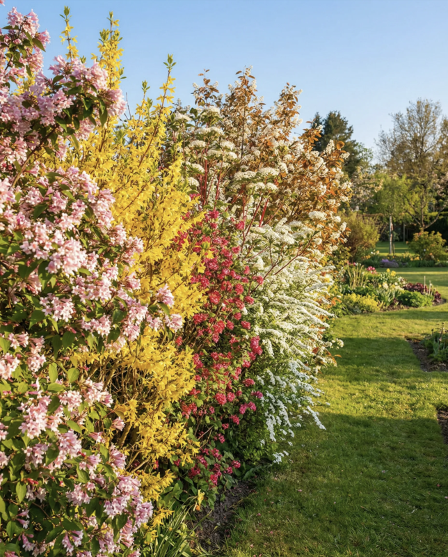 Auch außerhalb klassischer Heckenpflanzungen entfaltet die Blühhecke ihre Wirkung. Einzelne Sträucher wie die Felsenbirne oder der Perlmutstrauch eignen sich hervorragend als Solitäre, während Forsythie und Brautspiere in Gruppen gepflanzt farbige Akzente setzen.